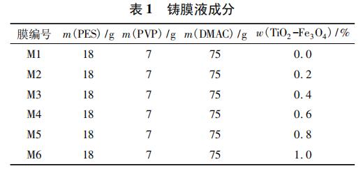 采用浸沒沉淀相轉(zhuǎn)化法制備膜,以 TiO2 -Fe3O4 為改性劑進(jìn)行共混改性,設(shè)計實驗配比,如表 1所示。