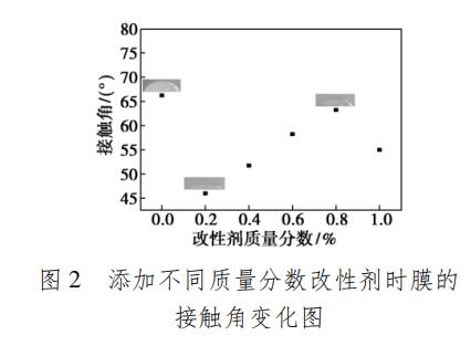 由圖 2 可以看出,當(dāng)不添加共混改性劑時,接觸角最大,說明單純的 PES 膜是疏水性比較強(qiáng)的膜,因為 PES 含有0.jpg基團(tuán),所以表現(xiàn)出疏水性。