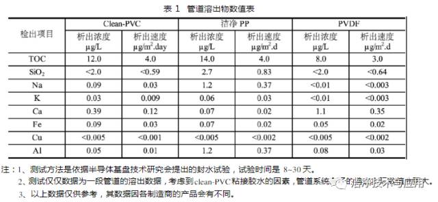 選擇管材的依據(jù)主要是管道的溶出物(見表1)及內(nèi)表面光潔度。主要應(yīng)用的管道有Clean-PVC管、潔凈PP管、PVDF管幾種。Clean-PVC管采用耐沖擊硬質(zhì)聚氯乙烯制造,其比普通PVC管含有較少的添加劑。從而減小了管道內(nèi)壁的粗糙度(Clean-PVC管的表面粗糙度小于0.37 μm,而普通PVC管的表面粗糙度在1.0 μm)以及污染物的析出。制造商主要有“積水國際貿(mào)易有限公司(SEKISUI)”、“日本旭有機(jī)材株式會社(ASAHI AV)”。潔凈PP管材質(zhì)為(β)-PP-H均聚型聚丙烯,具有非常均一、致密的結(jié)構(gòu)和出眾的抗沖擊強(qiáng)度。其高結(jié)晶度確保了極好的耐化學(xué)品性能,二氧化鈦色素的使用進(jìn)一步提高了此特性。其內(nèi)壁粗糙度及污染物的析出性能與Clean-PVC接近。制造商主要有喬治.費(fèi)歇爾管路系統(tǒng)有限公司(+GF+)。PVDF管材質(zhì)為聚偏二氟乙烯,是一種高結(jié)晶度,純水設(shè)備高性能熱塑性塑料,可用溫度/壓力范圍廣。其主要特性是力學(xué)強(qiáng)度高、韌性好、具有優(yōu)異的耐磨性、熱穩(wěn)定性和介電性,其純度高,能熔融成型,對于大多數(shù)化學(xué)品和溶劑都具有很好的耐腐蝕性、抗紫外線和核輻射性能好、耐候性好、耐生物菌類的作用、氣體和液體阻隔性好、阻燃性好、發(fā)煙量少等優(yōu)點(diǎn)。聚偏二氟乙烯是一種純凈的材料,它不含任何添加劑,且其表面光滑,粗糙度小于0.2μm。制造商主要有喬治?費(fèi)歇爾管路系統(tǒng)有限公司(+GF+)、奧地利AGRU公司。