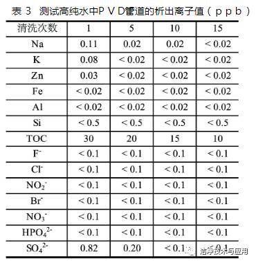 如表2所示,8英寸半導(dǎo)體對純水水質(zhì)指標(biāo)的要求相當(dāng)嚴(yán)格,Clean-PVC及潔凈PP已不能滿足其要求,而PVDF管道的溶出物及管道內(nèi)壁光潔度都遠(yuǎn)強(qiáng)于Clean-PVC及潔凈PP,故而只能選擇PVDF管道。在國內(nèi)的半導(dǎo)體生產(chǎn)中也有8英寸采用Clean-PVC管道的成功案例,但經(jīng)過實(shí)測分析后發(fā)現(xiàn),這類生產(chǎn)廠的產(chǎn)品都是從6英寸升級至8英寸的,也就是在6英寸純水管道系統(tǒng)運(yùn)行若干年后升級為8英寸的,而Clean-PVC管路系統(tǒng)經(jīng)過長時間運(yùn)行后,其溶出的離子呈逐步減少的趨勢。以某電子廠為例,一期廠房純水系統(tǒng)未設(shè)置專門的除TOC紫外線燈,僅依靠制備過程中對TOC的去除,在運(yùn)行了若干年后,其回水管道TOC可以達(dá)到15ppm,而二期新建的純水系統(tǒng),設(shè)置了專用的除TOC紫外線燈,在系統(tǒng)開始運(yùn)行階段的站房出口TOC,也只有50 ppm。正是由于這種特性,所以純水系統(tǒng)在投產(chǎn)前需經(jīng)過相當(dāng)長時間的沖洗運(yùn)行。所以在從6英寸升級到8英寸的生產(chǎn)中,經(jīng)過若干年沖洗的Clean-PVC管道也是有可能達(dá)到使用要求的。而PVDF管道可以在短時間內(nèi)沖洗到較低的指標(biāo),如表3所示。為了節(jié)省初投資,純水回水管道可以采用Clean-PVC或者潔凈PP管代替PVDF,由于純水回水需經(jīng)過拋光系統(tǒng)的再次處理,所以即使回水中有較多的溶出物也不影響供水的水質(zhì),只是會影響拋光系統(tǒng)的維護(hù)費(fèi)用,但長時間運(yùn)行后維護(hù)費(fèi)用的差別會逐步減小。