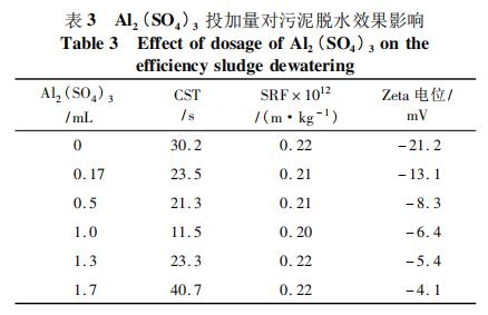 2.3 PAM 投加比為 1 /6 時,Al2 ( SO4 ) 3 溶液投加量對污泥脫水性能的影響如表 3 所示,先加入的陽離子 PAM 對污泥進行電荷中和作用,使污泥膠體脫穩。在開始階段,一方面,投加 Al2 ( SO4 )3 發揮絮凝的作用,形成污泥絮團。在此過程中,部分結合水被轉化為自由水,使得污泥中自由水的含量升高;另一方面由于正電荷的引入,也使得 Zeta 電位不斷增大,污泥間的靜電斥力不斷減小,更利于絮體的形成。當 Al2 ( SO4 )3投加量為 1 mL 時,CST 和 SRF 達到最小值,分別為 11. 5 s、0. 21 × 1011 m /kg,隨后繼續增加 Al2 ( SO4 )3 的投加量,反而導致污泥的 CST 與 SRF 回升。由于 Al3 + 與 PAM 中陽離子基團同電相斥,使得污泥顆粒間排斥作用加大,絮體難以凝聚。但是后階段的 Zeta 電位隨著陽離子的不斷引入仍然呈上升趨勢。從藥劑節省和脫水性能優化兩方面綜合考慮,確定 Al2 ( SO4 )3 最佳投加量為每毫升污泥中投加 1 mL。