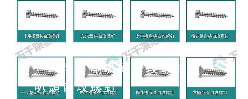 每一個自攻螺釘的構成都有四大要素:頭部形狀、扳擰方式、螺紋種類、末端型式。頭部形狀—頭部形狀各式各樣。有圓頭(半圓頭)、 扁圓頭、圓頭凸緣(帶墊)、扁圓頭凸緣(帶墊)、盤頭、盤頭凸緣(帶墊)、沉頭、半沉頭、 1.機螺釘 2.自攻螺釘 3.鉆尾螺釘 4.墻板釘 5.纖維板釘 6.木螺釘7.六角木螺釘 8.不脫出螺釘 9.組合螺釘 10.微型螺釘 11.家具螺釘 12.電子螺釘頭型:1.六角頭(hexagon head) 2.六角頭法蘭面(hexagon head with flange) 3.